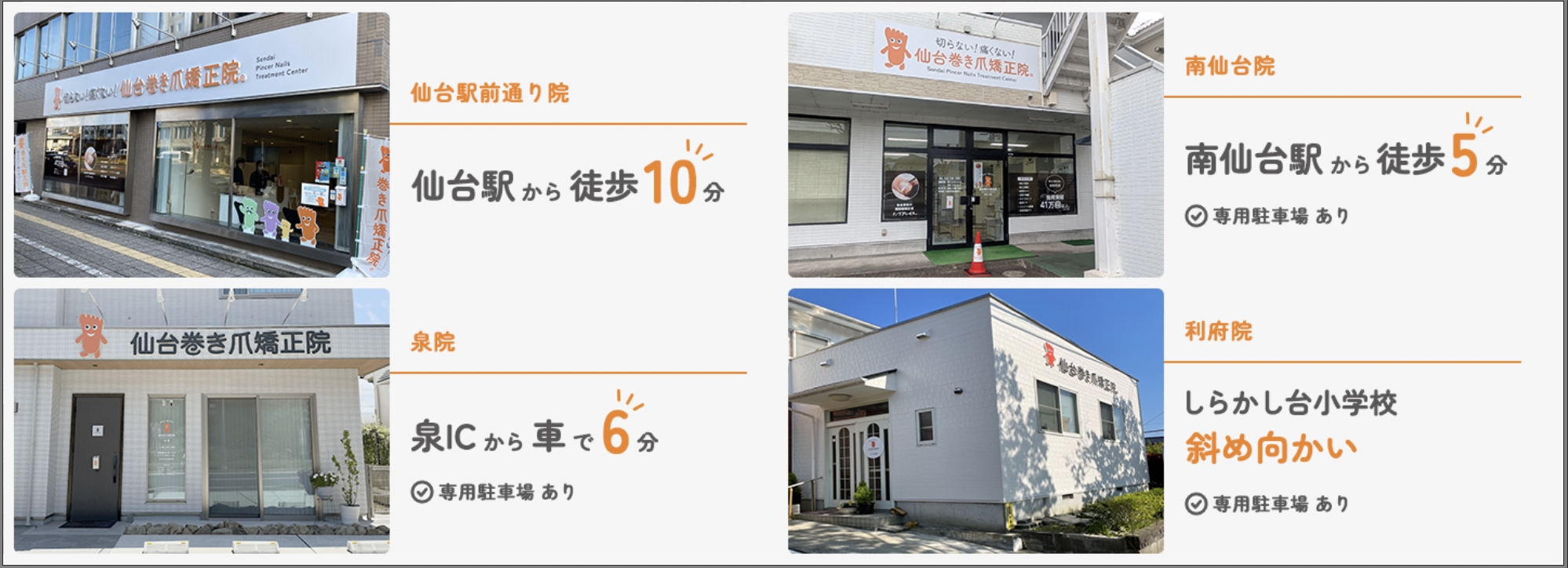 巻き爪矯正院グループは全国に45院、巻き爪の専門院としては日本最大規模のグループです。宮城県だけでなく、秋田、福島などの東北地方、東京、埼玉、千葉、神奈川、金沢、福岡にも店舗がございます。引っ越しでも安心。巻き爪で悩まれる知り合いの方にもぜひご紹介を。