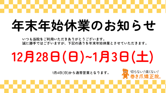 こんにちは、仙台巻き爪矯正院です。 2025年12月28日(日)~2026年1月3日(土)は、 年末年始休業とさせていただきます。 1月4日(日)より通常営業となります。(※仙台駅前通り院のみ。南仙台院、泉院、利府院は1月5日(月)より営業)
