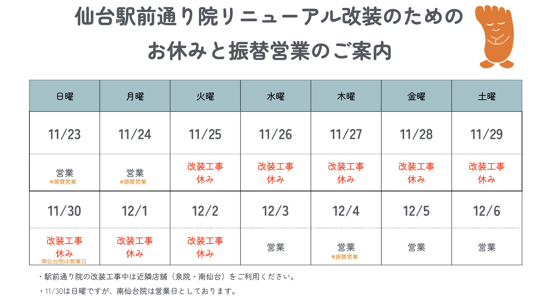 仙台駅前通り院では改装工事のため11/25(火)〜12/2(火)までお休みをいただきます。